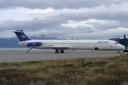 An Austral MD-83 in one of the former liveries, on the apron at Malvinas Argentinas International Airport. (2004)