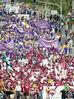The right to join a union, freely associate and take action including strikes, are universal rights in international law, enshrined after the experience of mass war and dictatorship.[102] Australian law provides minimal protection, and has been consistently criticised by the International Labour Organization.[103] There is a basic right to join a union, yet the High Court has made protection for discrimination against union members weak by enabling employers to argue they did not intend to target union members with adverse action. There is a right to collective bargaining, but only within "single-employer" enterprises, creating major legal obstacles to sectoral collective bargaining found in other prosperous countries. Key to this is the prohibition on the right to take solidarity action, i.e. workers of one employer striking with workers of another employer to get a multi-employer deal, especially to prevent anti-productive competition. There is a limited right to take collective action, to get a collective agreement with a single employer. Australia has a significant history of workers voting for representation on boards of directors of the corporations or other governing bodies where they work, particularly in New South Wales,[104] and in federal public services such as the ABC and Australia Post. However Australia has not yet passed a general federal law, like a majority of wealthier OECD countries, to protect the right to vote for directors at work.[105]