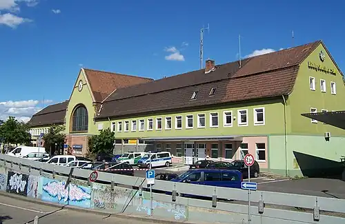 The first station in Bad Kreuznach was opened in 1858 with the Nahe Valley Railway and was later used as a freight yard, which is now closed.[5] Between 1896 and 1936, the Kreuznach Light Railways (Kreuznacher Kleinbahnen), a network of 750 mm gauge lines, also terminated at the station. On 1 June 1864 a second station opened in southern Bad Kreuznach called Kreuznach Bad to improve access to the southern part of the city. With the opening of the railway line to Gau-Algesheim in 1902, the present station was built at the junction of two lines between the two stations. The station went into operation in 1905 and the entrance building was built between 1905 and 1908. In due course the other two stations were closed.[6]