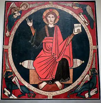 Around him are the four symbols of the Evangelists or the Tetramorph, each of which, instead of the book of the Gospel of earlier examples, has a sign or phylactery with his name. On John’s eagle and Luke’s bull can be observed, in particular, the subordination of the figure to its frame—that is, to the available space, even when this involves strange or unnatural distortion of the forms. Here, the way the configuration of these two symbols is dealt with is especially noteworthy. In addition, the pictorial style shows some figurative features of a more naturalistic type, such as the figure and face of Matthew’s angel, which comes closer to the new spirit of Gothic. This convergence of the resources of two pictorial languages shows the artistic influences and tensions of a time of change. As regards the colours, recent restoration has made it possible to recover the original very bright blue and red.