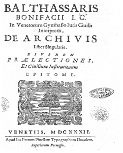 Baldassarre Bonifacio (5 January 1585 – 17 November 1659) was an Italian Catholic bishop, theologian, scholar and historian, known for his work De archivis liber singularis (1632), the first known treatise on the management of archives.[1]