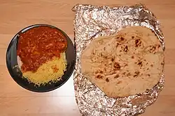 A balti or bāltī gosht (Urdu: بالٹی گوشت, Hindi: बाल्टी गोश्त) is a type of curry served in a thin, pressed-steel wok called a "balti bowl".[1] The name may have come from the metal dish in which the curry is cooked,[2][3] rather than from any specific ingredient or cooking technique.[4] Balti curries are cooked quickly using vegetable oil rather than ghee, over high heat in the manner of a stir-fry, and any meat is used off the bone. This combination differs sharply from a traditional one-pot Indian curry which is simmered slowly all day. Balti sauce is based on garlic and onions, with turmeric and garam masala, among other spices.[3]