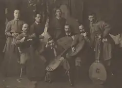 Prominent early 20th century bandurists in Ukraine Fedir Zharko, Hnat Khotkevych, Mykhailo Domontovych, Omelchenko Andriy, Serhiy Bashtan, Volodymyr Kabachok,