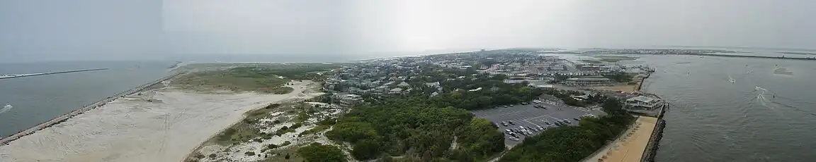 The continued threat of storms such as the Great Atlantic Hurricane of 1944 and the Ash Wednesday Storm of 1962 reinforced concerns about Barnegat Light's survival in the long term and the survival of the lighthouse and beachfront homes in the near term. The first attempt at stabilizing the shoreline came in 1939-40 when a combination of rock jetties and earthen dams were used to reroute the inlet current away from the shoreline. The massive effort succeeded and stopped the erosion that had doomed the eastern beach blocks, threatened the lighthouse, and erased the former port at 6th street. A diagonal jetty extending hundreds of yards NNE from East 8th Street forced the current far away from land before it entered the channel between the lighthouse and southern tip of Island Beach, while the damming of the existing current's channel along the backside of the Island between West 20th Street and High Bar, plus the damming of a channel between High Bar and an island WNW of the inlet, rerouted the current a mile north and west of Barnegat Light, sending it farther into the bay away from the town. The construction of the existing jetty in the early 1990s further stabilized the earlier work, straightening the southern jetty of the inlet and reclaiming virtually all of the eastern shoreline from East 8th Street to the lighthouse that was lost over the last century, much of which was not redeveloped and instead designated as parkland, which in 2020 included the addition of a bird sanctuary. The jetties have provided stabilization to the shoreline and especially the previously unstable and occasionally shallow inlet. To maintain the channel, the inlet requires annual dredging by the United States Army Corps of Engineers. In addition to the lighthouse, Barnegat Light continues to host a United States Coast Guard station, now located on the bay at West 6th Street, reflecting the continued presence of the former United States Life-Saving Service and its vital duties on the still treacherous waters of Barnegat Inlet and out on the Barnegat shoals.[34] In line with the borough's history, its most prominent industries continue to be tourism and fishing.