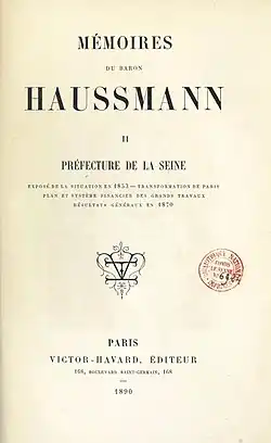 19. ^ (in French) Baron Haussmann, Mémoires, trois tomes publiés en 1890 et 1893. Nouvelle édition établie par Françoise Choay, Seuil, 2000. See also l'exemplaire de Gallica.