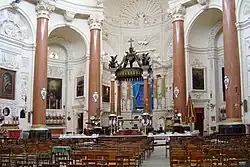 The 20th century church has been described as an example of neoclassical architecture.[10] It has a large, 42 m (138 ft) high oval dome which occupies a prominent position in the Valletta skyline facing Marsamxett.[8] Internally, the church has columns of red marble.