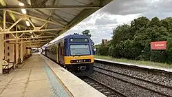The waiting shed on the Down platform dates from 1916 and is a simple weatherboard shed, in juxtaposition to the grand building on the other platform.[3]