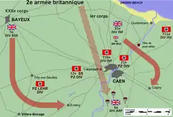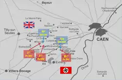 Operation Perch was intended to create the threat of a British break-out to the south-east of Caen by XXX Corps, with the 50th (Northumbrian) Infantry Division capturing the road to Tilly-sur-Seulles.[41] The 7th Armoured Division would then spearhead the advance to Mont Pinçon.[42][43] On 9 June, Montgomery ordered that Caen be taken by a pincer movement.[44] The eastern arm of the attack would consist of I Corps with the 51st (Highland) Infantry Division, which was to cross into the Orne bridgehead and attack southwards to Cagny, 6 mi (9.7 km) south-east of Caen. XXX Corps would form the western arm of the pincer; the 7th Armoured Division would advance to the south-east and cross the Odon River, to capture Évrecy and Hill 112.[45][46] XXX Corps attacked Tilly-sur-Seulles against the Panzer Lehr Division and part of the 12th SS Panzer Division, which held Tilly despite many casualties on both sides.[47][48][49]