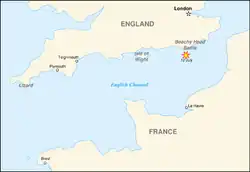 After evading Killigrew off Cadiz, the Toulon squadron (Château-Renault) joined Tourville's fleet on 21 June.[11] Tourville, commanding the combined Brest and Mediterranean fleets, with 75 ships of the line and 23 fire ships, sailed on 23 June into the Channel. By 30 June, the French were off the Lizard. Torrington sailed from the Nore, already convinced the French would be stronger – much of the Royal Navy had been diverted to protect their maritime commerce from privateers and the Allied fleet had only 56 English and Dutch ships of the line, with 4,153 guns, against the French fleet of 4,600 guns.[12][13]
