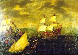 4. ^ In the middle of 1605, a Spanish convoy, under Pedro Sarmiento, was attacked and partially destroyed by Haultain in the Dover Strait.[16][17]