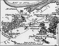 The Ottoman and Arab force travelled across the Sinai Peninsula on the northern route, which runs not far from the coast of the Mediterranean Sea and nearly parallel with it. A series of oases with date palms and reliable water stretch for 15 miles (24 km) from Bir el Abd in the east to Oghratina, Katia and Romani near the Suez Canal.[18] These oases make the northern route from the Ottoman-Egyptian Frontier at Rafa to El Arish and Romani viable, and British strategists thought it possible that 250,000 Ottoman troops could cross the Sinai, and 80,000 be based permanently in this fertile area. Whoever could hold the contested ground in the area of Katia and Romani would be in a position to protect the Canal, or within striking distance.[19] The area was patrolled almost daily by Ottoman aircraft, which bombed the recently established Katia camp on 20 April, and both Katia and Romani the next day.[20]