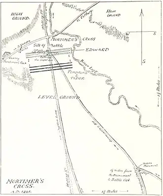 With York's death, his titles and claim to the throne descended to Edward of March, now 4th duke of York.[4] He sought to prevent Lancastrian forces from Wales, led by Owen Tudor and his son Jasper, Earl of Pembroke, from joining the main body of the Lancastrian army. The elder Tudor had been second husband to Catherine of Valois, widow of Henry V; their sons (Jasper and Edmund Tudor), as Henry VI's half-brothers, had been made earls, and the family was a major power in South Wales. His army included Welshmen, drawn especially from the Tudor lands in Carmarthenshire and Pembrokeshire, along with French and Breton mercenaries and Irish troops led by James Butler, Earl of Wiltshire and Ormond.[5] Edward, based at Wigmore Castle had gathered his army from the English border counties and from Wales. Among his leading supporters present were Lord Audley, Lord Grey of Wilton, Sir William Herbert of Raglan, Sir Walter Devereux and Humphrey Stafford.[6] After spending Christmas in Gloucester, he began to prepare to return to London. However, Jasper Tudor's army was approaching and he changed his plan; to block Tudor from joining the main Lancastrian force which was approaching London, Edward moved north with an army of approximately five thousand men to Mortimer's Cross.