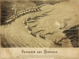 The Brazilian Navy fleet consisted of the Amazonas frigate (flagship), Apa, 6 gunboats: Ipiranga, Beberibe, Mearim, Araguary, Ivahy and Iguatemy; corvettes: Parnahyba, Belmonte, Maje, and Itajaí. Once past the gauntlet, Barroso continued another 9.6 km downstream, where he stopped for the night. Bruguez meanwhile, backed up batteries and headed once again down river to Punta Cuevas, 25 km south of the town of Bella Vista, where he repeated his action against the fleet in the Battle of Paso de Cuevas.