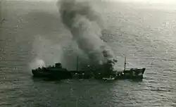 Italian tanker Minatitlán on fire and sinking at dawn, 9 November 1941