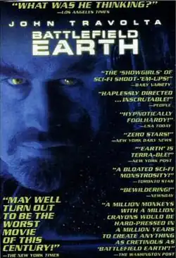 Battlefield Earth frequently appears on worst film lists,[95][96][97][98] and is included on Rotten Tomatoes' "100 Worst of the Worst Movies" list.[99] Rotten Tomatoes ranked the film 27th in the 100 worst reviewed films of the first decade of the 21st century.[6][100] The Arizona Republic listed it as the worst film of 2000, and called it a "monumentally bad sci-fi flick".[101] In 2003, Richard Roeper placed the film on his alphabetized list of his forty least favorite films of all time, writing, "The real danger of Scientology is that John Travolta may someday make another movie based on the writings of L. Ron Hubbard."[102] In 2001 the film received the "Worst Picture" award from the Dallas-Fort Worth Film Critics Association.[103] James Franklin of McClatchy-Tribune News Service put the film as the worst of his "summer blockbuster bombs" list, giving it a rating of four stars for "traumatic" on his scale of how the films "generate a perverse sense of nostalgia".[104] Christopher Null of Filmcritic.com listed the film's villain Terl at number 8 of his "10 Least Effective Movie Villains", writing: "we still can't imagine how anyone would go face to face with one of these creatures and react with anything other than simple laughter."[105]