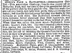 Queen's Park protested on several bases, including having one goal wrongly disallowed, and three of the Battlefield players not having been registered, but the protests were dismissed. The size of the shock can be measured by Queen's Park reaching the FA Cup final that season.