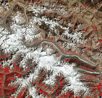 Satellite imagery of the Batura Glacier as of 2022. The big white area is the Batura Muztagh mountains; the glacier is the long snaky area on the mountains' north side.