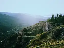 Beginning in the Eastern Sayan mountains it flows west-northward without a contact with populated places until the very confluence with the Yenisey in the suburbs near the southwestern edge of the Krasnoyarsk city. The valley is mostly deep and winding with the banks covered with conifers.