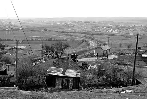 Beaufort station was situated in a cutting to the west of a road bridge.[13] It stood opposite the Beaufort Ballroom and adjacent to the Beaufort Arms Public House. It had two platforms accessible by flights of steps leading down from the road bridge.[14] The main station building was built of stone, with a timber waiting shelter was provided on the opposite platform.[9] As Beaufort is situated 1,200 feet (370 m) above sea level, harsh winters such as that of 1946-47 could result in the cutting being blocked with snow.[15] The line to Ebbw Vale closed on 2 April 1951.[16][17] The Abergavenny line was the next to close when passenger services ceased on 4 January 1958.[18] The last passenger service over the line was an SLS railtour on 5 January 1958 hauled by LNWR 0-8-0 49121 and LNWR 0-6-2 tank 58926'[18][19] Final closure came on 2 November 1959 when coal traffic from Tredegar ceased.[9][20]