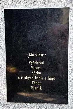 Smetana's funeral took place on 15 May, at the Týn Church in Prague's Old Town. The subsequent procession to the Vyšehrad Cemetery was led by members of the Hlahol, bearing torches, and was followed by a large crowd.[100] The grave later became a place of pilgrimage for musical visitors to Prague.[103] On the funeral evening, a scheduled performance of The Bartered Bride at the National Theatre was allowed to proceed, the stage draped with black cloth as a mark of respect.[100]