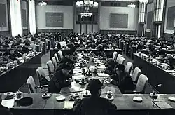 Because of the advocacy of "streamlining institutions" and "delegating cadres to work", the Beijing Revolutionary Committee was "united" from its formal establishment on April 20, 1967, until the establishment of the Fourth Beijing Municipal Committee of the CCP on March 15, 1971. That is, there was no title of Beijing Municipal Committee of the CCP.[22] After the establishment of the Fourth Beijing Municipal Committee of the CCP, the powers of the party and government began to separate.[23] In December 1979, the Third Session of the Seventh Beijing Municipal People's Congress abolished the Beijing Revolutionary Committee and restored the Beijing Municipal People's Government. The district and county people's governments and street offices were also restored.[24]