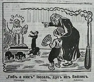 In February 1911, the State Duma for the first time began discussing a bill on the abolition of restrictions on Jews and, first of all, on the abolition of the Pale of Settlement,[40] at the same time a bill on the introduction of Zemstvo in the Western Territory was being considered, under which Jews had no voting rights. The struggle around the issue of Jewish equality was extremely acute at that moment, and the ritual version of Yushchinsky's murder became a key argument in antisemitic publications.[41][42][43][44]