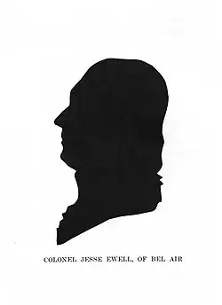 As the eldest son, Jesse Ewell inherited Bel Air and its slaves. In 1760, he enrolled in the College of William & Mary, where he befriended Thomas Jefferson, a classmate. During his fifty years as master, Ewell—who was sometimes referred to as "Ole Marster" or "Ole Colonel of all"—created a fortune.[18] Described as an eccentric "man of distinction and liberal fortune," Ewell was said to ride to Dumfries to tend to his business affairs on his "fiery black steed."[12][15] He also served as the County Sheriff.[19] Although Ewell was known for his keen mental abilities and literary talent, he was apparently indolent and slow in movement, and even Thomas Jefferson needled him for not exercising his talents.[20]