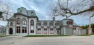 Belcourt is located on Bellevue Avenue at Lakeview Avenue, in Newport. A 50,000-square-foot (4,600 m2), 60-room summer villa, it was designed by Richard Morris Hunt for 33-year-old Oliver Belmont, who during the construction was divorced from Sara Swan Whiting and the father of a daughter, Natica, for whom he denied paternity. It was based on the Louis XIII hunting lodge at Versailles, and incorporated Oliver's love of pageantry, history and horses in its magnificent interior halls, salons and ballrooms.[2] The Belmont Stakes was named for his father, August Belmont Sr., and Oliver was known for his skill as a four-in-hand carriage driver.[3] Belmont wanted Belcourt designed precisely to his specifications. Hunt was hesitant, but concentrated on his guiding principle that it was his client's money he was spending. Construction cost $3.2 million in 1894, a figure of approximately $80 million in 2011 dollars. Belmont employed some thirty servants at Belcourt, with aggregate wages of approximately $100 per week,[4] or approximately 40% of the national average wage at the time.[5]
