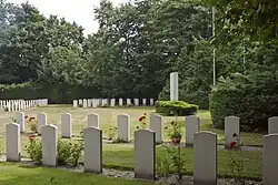 During the First World War, around 33,000 Belgian soldiers fled to the neutral Netherlands after the Belgian city of Antwerp fell to the German troops in 1914. In compliance with the 1907 Hague Convention, the military refugees were disarmed and interned by the Dutch. Through the influx of refugees, Harderwijk, where a refugee camp was located, tripled its population.[1] Most of the victims buried at the Belgian Military Field of Honour died of tuberculosis, or the 1918–1919 outbreak of the Spanish flu. Therefore, many of the 349 soldiers died in 1918 or 1919. Other buried refugees include six victims of the uprising at camp Zeist in Soesterberg on 3 December 1914, when the interned refugees revolted against the bad living conditions in the camp, provoking the Dutch guards to violently suppress the uprising.[2]