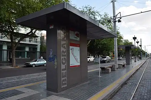 Belgrano is a light rail station at the intersection of Avenida Belgrano and Martín Zapata/Montevideo in the City of Mendoza, Capital Department, Province of Mendoza, Argentina.