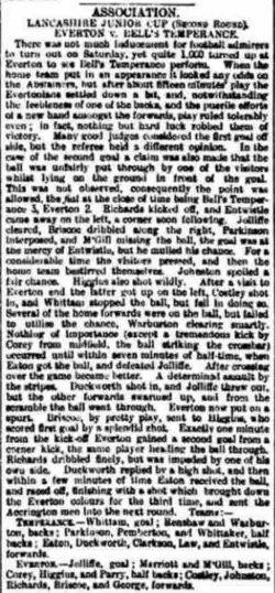 Bell's won the first Lancashire Junior Cup in 1885–86, beating Darwen Rovers 6–2 in front of 4,000 spectators at the Fleetwood Rangers ground, with goals from Holgate (2), Parkinson, Heaton, Sprone, and Entwistle - the score was 1–1 at half-time but Bell's had played into the wind in the first half.[7] It retained the trophy in 1886–87, having originally been knocked out by Lostock Hall in a fifth replay but successfully appealing the defeat on the basis that Lostock had fielded professionals.[8] En route to the final Bell's beat Everton 3–2 at Anfield.