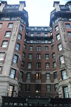 The facade is largely made of red brick with ornamentation made of limestone, metal, and terracotta.[13][20] This contrasted with later buildings by Roth's firm (including the San Remo), which generally contained buff-brick and limestone facades.[21] Both the Broadway and 77th Street elevations of the facade are divided horizontally into three sections: a two-story base, a six-story midsection, and a two-story capital. the third through seventh stories are largely clad with brick; and the ninth and tenth stories form a mansard roof.[13][20] The southern and eastern elevations are largely clad in plain brick and contain windows; the southern elevation is a party wall abutting another building.[22]