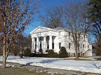 It is a two-story, heavy timber-framed structure built in 1846 in the temple front Greek Revival style. It features a hipped roof and a massive Classical portico with four fluted Doric order columns. Also on the property are a frame carriage barn, garden house/playhouse, and square brick smokehouse.[2]