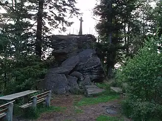 On the main rock there is a 3-metre-high stone cross dating to 1877 and, since 1995, a semi-circular toposcope made of steel. This provides information about the direction and distance of those places and mountains that are visible over a radius of 18 km and also several more distant locations such as Karlsruhe and the Hornisgrinde as well as non-visible locations such as the Feldberg and Mont Blanc. It also gives the position of sunset on the visible horizon at the summer and winter solstices as well as at the equinoxes, with dates and times. In addition it gives the length of days (time between sunrise and sunset) in hours and minutes at the start of each season as well as the height of the midday sun (highest point of the Sun during its visible trajectory) in degrees, also at the start of the seasons. In entirely other dimensions are given the average distance from the Earth to the Moon, the Sun the orbit of the planet Pluto and the nearest star in km and light years as well as distances to the Earth's interior.
