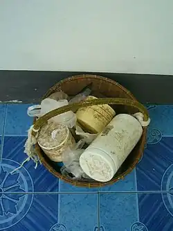 In order to chew maak the traditional Thai way, three main ingredients are needed: betel leaf, betel nut and red limestone paste.[4] Before a betel chew, the betel nut is boiled, sliced and dried.[1] A popular method is to cut the betel nut into four smaller sections before solar drying, since betel nut can be very strong. After the betel nuts have dried, they are normally laced on a string (usually as long as 50 cm) and hung around the house to use as needed; this is a popular method because the dried betel nut can be stored longer. Additionally, other ingredients can be added such as Plai (Zingiber Cassamunar) or Tobacco.[3]