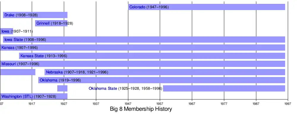 The conference was formed in 1907 as the Missouri Valley Intercollegiate Athletic Association (MVIAA) by five charter schools: the University of Kansas, University of Missouri, University of Nebraska, University of Iowa, and Washington University in St. Louis. After the MVIAA grew to ten schools, six state schools split away on their own in 1928, becoming known as the "Big Six": Iowa State, Kansas, Kansas State, Missouri, Nebraska and Oklahoma. The University of Colorado was added in 1948, and the conference became known as the "Big Seven Conference". Oklahoma State joined in 1958, becoming the eighth and final member. The conference broke up when its members joined the Big 12 Conference in 1996.