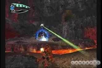 Bionicle is a 3D platform game.[1] The game's levels vary between normal platforming levels and levels that use mechanics like snowboarding or lava surfing.[2] Lightstones are scattered throughout each level, and collecting them unlocks bonus content.[3] Captive Matoran characters are located in some levels, and finding them is necessary to solve puzzles.[4] Each Toa character can attack using elemental energy; the attacks automatically target enemies. By timing attacks correctly, the player can launch a multi-bolt attack.[5] Elemental energy depletes after each use. In order to replenish their supply, the player can shield and absorb attacks from enemies or draw in energy directly from the environment. When drawing from the environment, the player is vulnerable to attack.[6] Elemental energy can also be resupplied by finding masks – called Kanohi – of elemental energy.[5]
