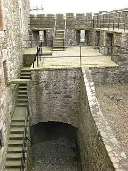 Between 1534 and 1540, a programme of fortification was carried out under the direction of the King's Master of Works, Sir James Hamilton of Finnart.[9] Finnart, the illegitimate son of the Earl of Arran, was an expert in artillery fortification. Having spent time in Europe studying the subject, he designed his own castle at Craignethan in Lanarkshire as a showcase for his ideas.[10] At Blackness, he introduced technological innovations including a complex entrance with a caponier, one of only three surviving in Scotland (the others being at Craignethan and Stirling Castle). The caponier, a passage within the external wall of the entrance, allowed defenders to fire into the entrance area, at the backs of any attackers who had breached the gate. The curtain wall was thickened on the inside to the south and east, from 1.5 m (5 ft) to over 5 m (16 ft) in places, and gun ports were opened up. The south wall was also heightened to enclose the new south tower.[11]