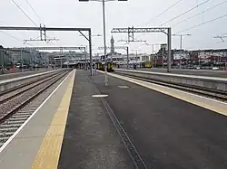 In November 2010, it was announced that the lines between Preston and Blackpool would be electrified, along with the line between Manchester and Preston.[5] This resulted in the semaphore signalling at the station being replaced by modern colour lights controlled from the WCML North Rail Operating Centre in Manchester and the station track and platform layout being altered, with the eight curved platforms reduced to six and on a straighter alignment than previously. The project was due for completion by May 2016,[6] with the line onwards to Manchester following by the end of the year. This was subsequently pushed back twice - first to March 2017 and then again to early 2018 (after contractors Balfour Beatty pulled out), so that the track remodelling and re-signalling work could be carried out at the same time as the wiring, reducing disruption to passengers (as only one period of closure would be required).[7][8]
