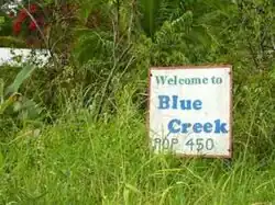 Blue Creek is a village in the Toledo District of Belize. It is a Mopan people and Kekchi village of about 270 people. The community lies along flat roads, spanning both sides of Blue Creek. Clusters of thatch huts border both sides of Blue Creek, a beautiful, clear stream emerging from the surrounding thick jungle. The colour of blue-green pool where Maya women beat their laundry on the smooth stones gave the village its name. The banks are lined with tall shady trees. The reflection of the thick jungle rainforest, which lines both sides, is clearly visible in the surface of the creek.