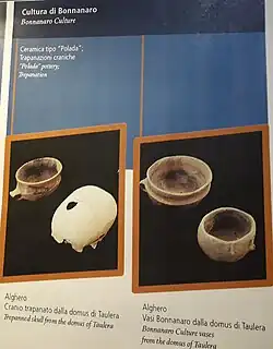 About 200 human skeletons of the period show that the Bonnanaro population (phase A1) was composed mainly of dolicochepalic individuals (67%) with a minority of brachycephalics (33%), the latter concentrated in the north-western portion of the island.[9] The average height was 1.62 m for men and 1.59 m for women.[10] The Bonnanaro population suffered from osteoporosis, hyperostosis, anemia, caries and tumors. Cranial trepannation was practiced.[11]