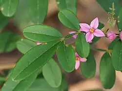 Boronia umbellata, commonly known as the Orara boronia,[2] is a plant in the citrus family Rutaceae and is endemic to a small area on the north coast of New South Wales. It is an erect shrub with many branches, aromatic, pinnate leaves and clusters of up to ten dark pink flowers in the leaf axils.