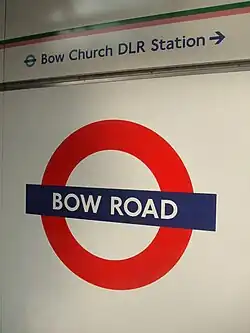 Bow Road is connected eastwards via the thoroughfare of the same name to Bow Church station on the Docklands Light Railway (DLR) as an out of station interchange (OSI); they are classed as a single station for ticketing purposes but managed as separate stations.[1]