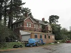 Brackley Central station - the platform side in October 2008, showing that what appears to be the ground floor from the approach road is actually the upper floor of a two-storey building. At the far (north) end of the building can be seen the bricked up remains of the footbridge that led to the platform, while the grassy bank bottom left is a surviving remnant of the unfinished Northampton branch platform.