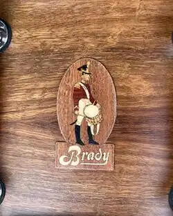 Brady Drums were notable for several factors of their drum construction. Firstly, the original badge was hand-made using a meticulous micro-marquetry technique using at least 31 different wood species to create the image of the drummer, drum, and trade mark.[2] Secondly, Brady Drums first used a single ply drum shell made not from bent wood, but a hollowed out trunk which was also an industry first, and likely helped Brady propel in notoriety.