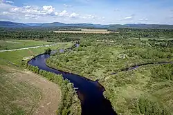 - 1.8 kilometres (1.1 mi) towards the south-east, by forming a hook towards the south-west, collecting the discharge (coming from the east) of a lake and bypassing seven small islands, up to at the Noir bridge (route 365);