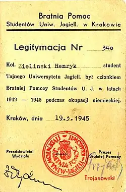 Document stating Bratniak membership at the Jagiellonian University during the Nazi German occupation of Poland