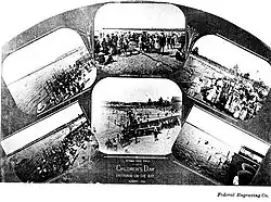 By 1904, the trolley company had built a wide pier 1,000 feet long out into the river. Along the east side, there were cottages, and the Boat club house. Along the south side, the land between the road and the lake has been turned into a park, with pavilions and bath houses. The beach was ideal for bathing, since people could wade out almost to the end of the pier without danger. The village, with its two churches and neat cottages, was one of Ottawa's most fashionable suburbs in 1904. Justice Mosgrove had a 35-acre grape farm, not far from Britannia Park, on the river.[4]