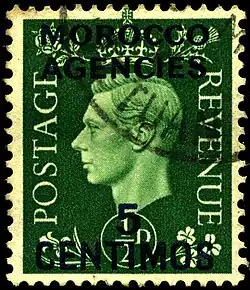 British-currency stamps were available at any office, and primarily intended for parcels and, later, airmail. Both regular and some commemorative issues were overprinted, all with "MOROCCO / AGENCIES", up to the Edward VIII issue of 1936. Subsequently, unoverprinted stamps were used, until 1949, when they were again overprinted for use at Tetuan (at that point the sole remaining office, except for Tangier, which had its own overprints).