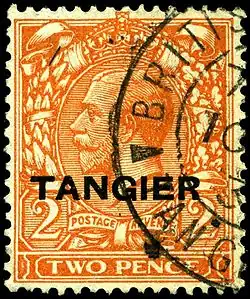 The Tangier International Zone received its own overprints beginning in 1927. As British currency was in use in that office, the overprint simply reads "TANGIER". This continued through 1956. On 1 April 1957, a commemorative overprint added "1857–1957" to celebrate the 100th anniversary of the post office, but this had a very short shelf life; the office at Tangier was closed and the stamps withdrawn from sale on 30 April 1957.[3]